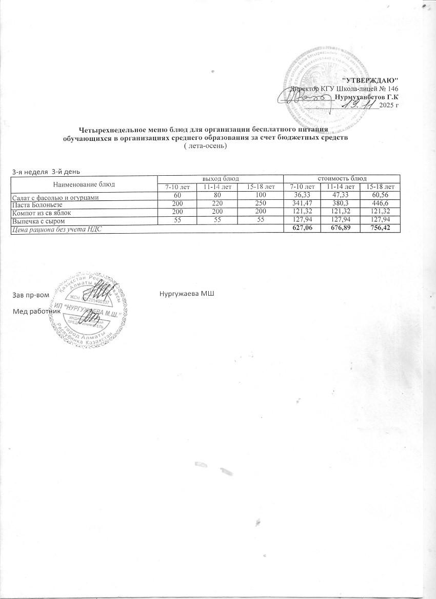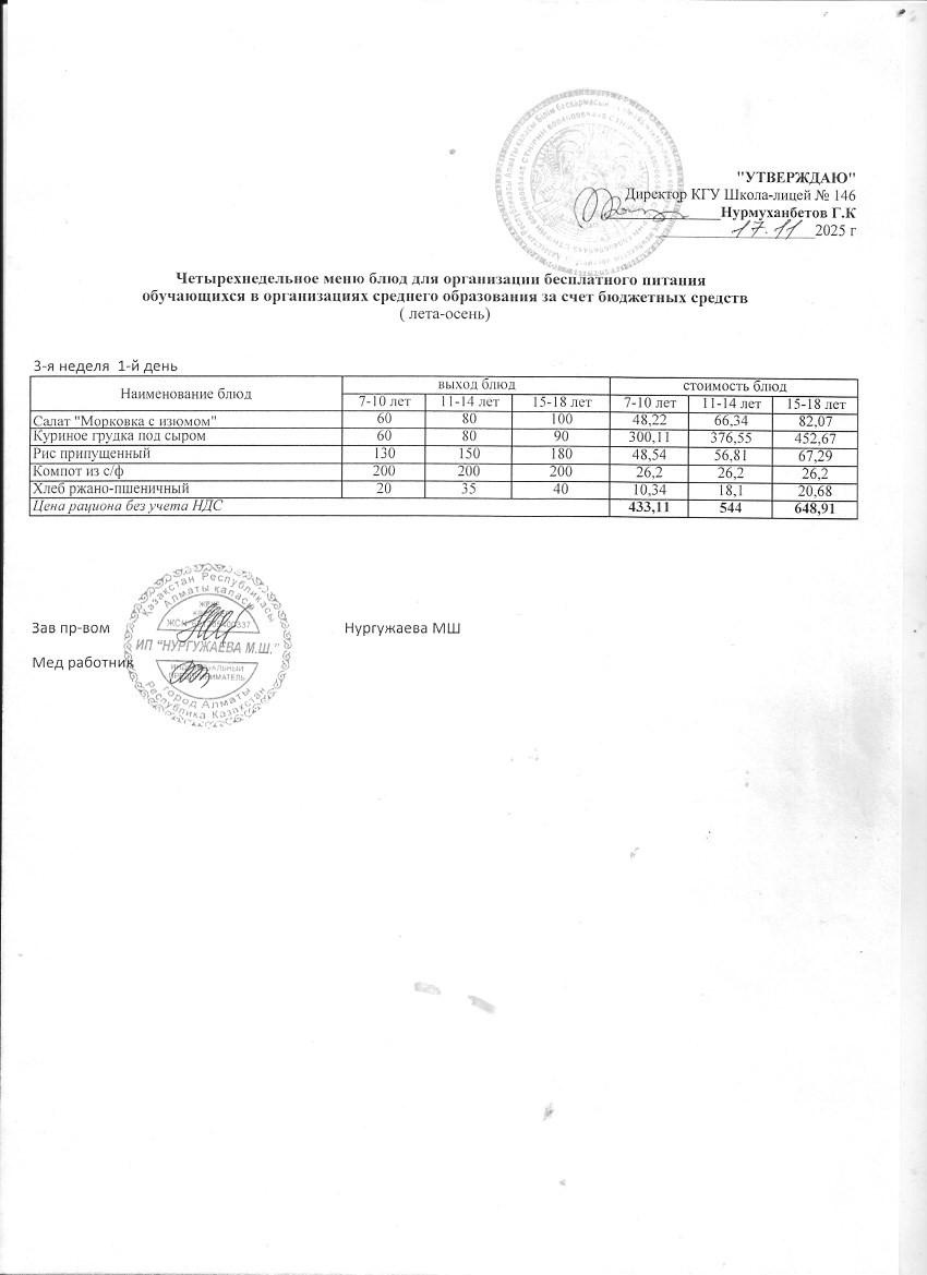Ас мәзірінің тағамы (қараша айы, 1 апта, 3 күн)